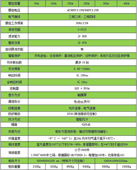 解決方案RGAF型有源濾波器采用電力電子元件,以開關(guān)頻率IGBT產(chǎn)生高次電流抵消諧波電流。設(shè)備中電子元件的過電壓、設(shè)備的發(fā)熱處理是困擾APF技術(shù)的二大瓶頸。采用3個(gè)H橋技術(shù),徹底解決了低壓APF的上述問題,榮廣電氣的APF具有以下優(yōu)點(diǎn):1. 采用諧波電流的預(yù)測(cè)控制方法,響應(yīng)速度快、濾波能力強(qiáng)、運(yùn)行損耗小。可完全滿足不同的工況需求;2. 能同時(shí)動(dòng)態(tài)實(shí)時(shí)濾除全部諧波或多種選定的諧波;采用矢量篩選技術(shù),可對(duì)2到50次之間的諧波進(jìn)行有選擇的補(bǔ)償。3. 在濾除諧波的同時(shí)動(dòng)態(tài)補(bǔ)償基波無(wú)功,提高功率因數(shù)。也可以在零無(wú)功功率的情況下濾除諧波,避免無(wú)功反送情況出現(xiàn);4. 安全性好,不存在諧振或電壓放大設(shè)計(jì)有接入電抗器,可自動(dòng)限制輸出電流,裝置永不過載,保證裝置安全可靠工作;5. 可對(duì)不平衡進(jìn)行補(bǔ)償,避免負(fù)序電流對(duì)電網(wǎng)及電氣設(shè)備影響;6. 智能啟動(dòng)系統(tǒng),一鍵并網(wǎng)7. 電氣部分采用H橋連接:把系統(tǒng)線電壓分解成相電壓處理,大幅提高了設(shè)備的可靠性。輸出電流波形平滑,裝置損耗低,自適應(yīng)控制算法,能適應(yīng)任何系統(tǒng)阻抗的變化。8. 3H橋式結(jié)構(gòu):每一相分別控制,提高了整個(gè)系統(tǒng)的可控性,例如當(dāng)其中一相諧波電流過高,進(jìn)行補(bǔ)償時(shí),不會(huì)影響其他兩相的補(bǔ)償效果。同時(shí)3H橋式散熱效果好,它采用A、B、C三相分別散熱,每相電抗器與IGBT分別配有專門的散熱風(fēng)扇。配置參數(shù)